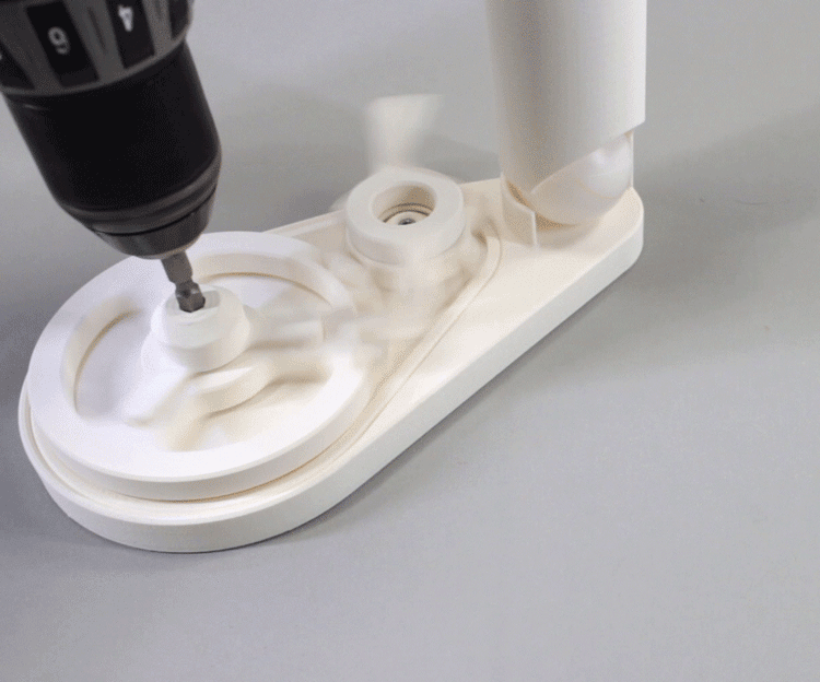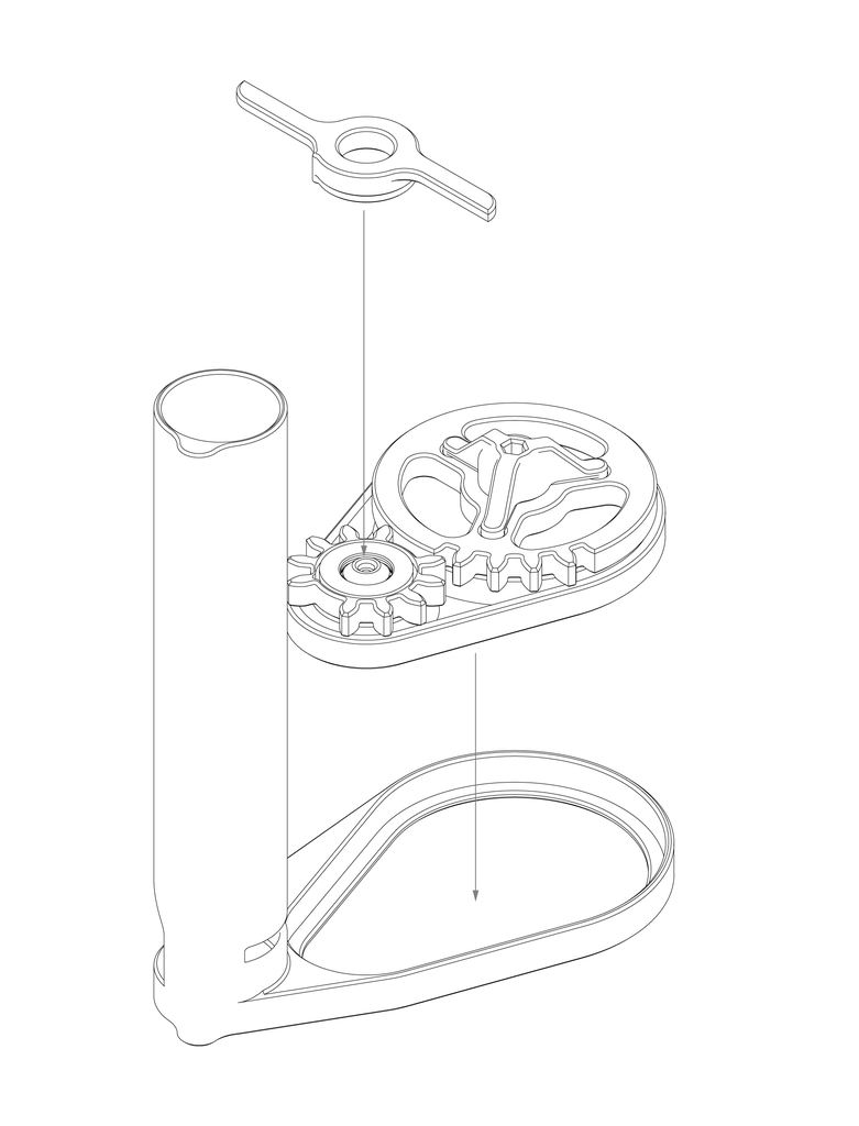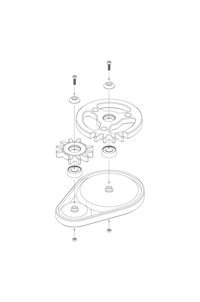 Basic, the bearings are placed on the posts on the base. The screws and nuts living the bearings in piazza and the gears press fit onto the bearings.