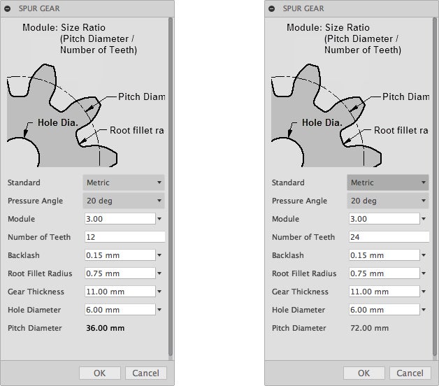 I'm going to make a 2:1 gear mechanism ratio with the large gear beingness the driver. That way that the smaller gear will have 2 rotations to every 1 gyration of the larger gear. The little gear wish rotate twice American Samoa immoral. Watch the video above if you want to have a go at it more about what the parameters mean.