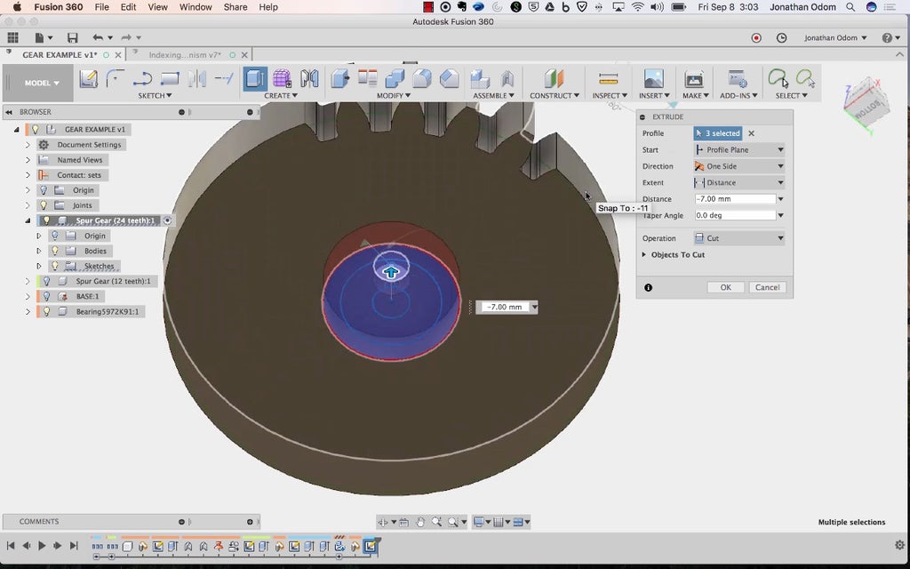 I reprise the Sketch - Project - Extrude steps I used for the other gear wheel, once once again devising sure I'm solely cutting done the gear by concealing the bearing in the Browser.