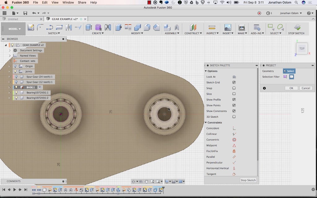 Now I need to cook caps to harbor down the bearings. I create a sketch in the side plane, which is coincident with both of the gear axes. I go to Sketch > Project / Let in > Cross.