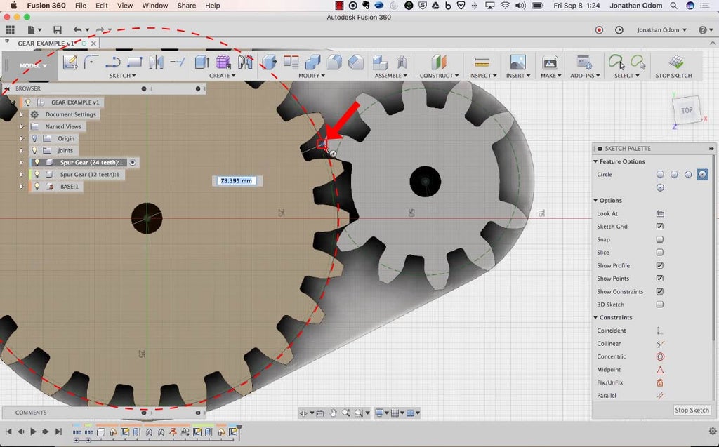 The circle you'll need on this gear mechanism is going to make over a surface for the littler gear to bear on while the large one turns. This circle has to snapshot to the recess of one of the dentition on the sides of the gap as shown in the screenshot (you'll ensure why below).