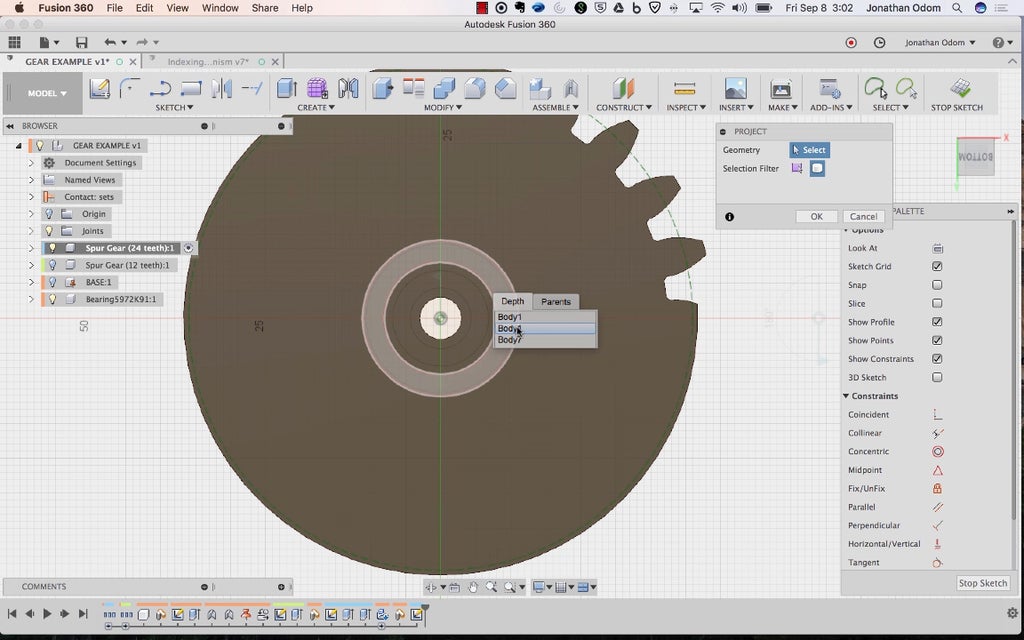 With the gears in situ, you'll have to cut out or s of the teeth to get the indexing effect. I'm going to make the smaller gear bash the indexing, soh I draw a Sketch circle snapped to the gear's root.